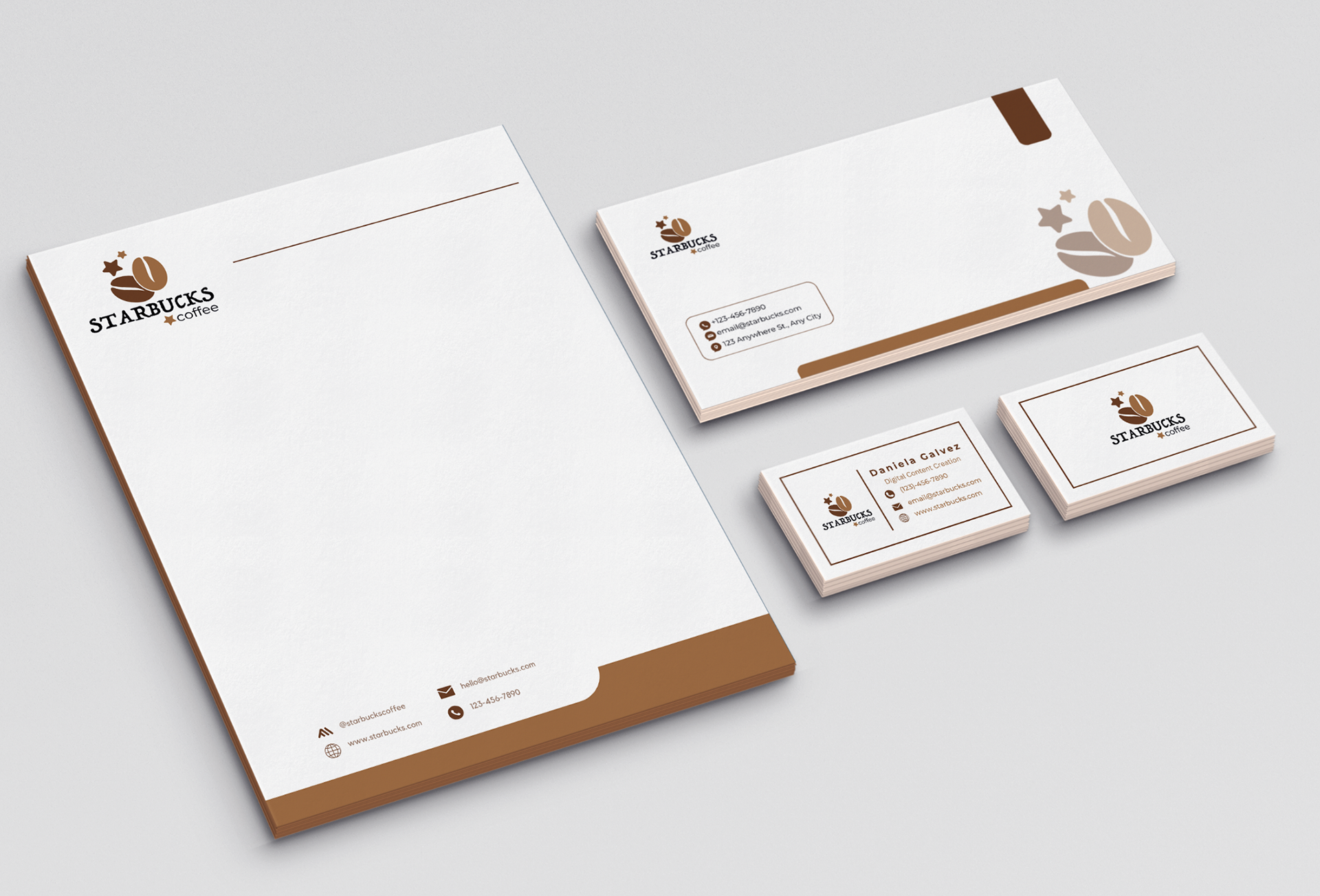 Along with creating a new logo, I developed simulated representations of various branding elements such as business cards, envelopes, and STARBUCKS' CUP. These mockups aimed to demonstrate the cohesive integration of the new visual identity across diverse mediums.